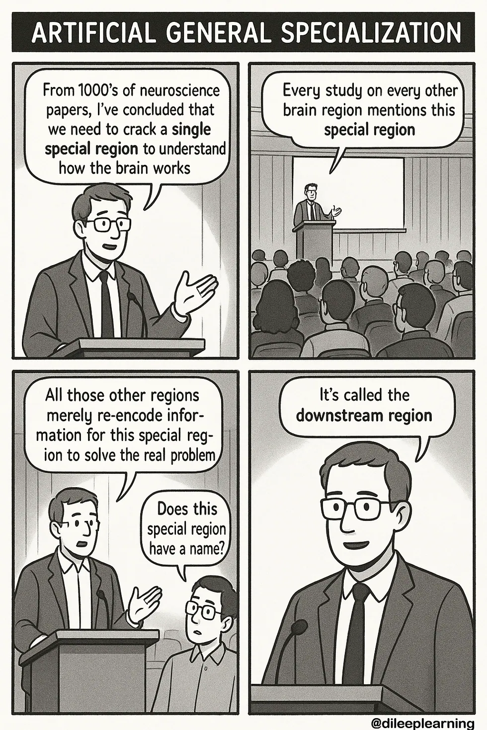 Neuroscientists who study brain regions or circuits almost always fall for this trap of a story of a downstream region. What does brain region A do? It transforms information to make it easier for a 'downstream' region B.....and the neuroscientist who studies B makes the same statement...ad inf.